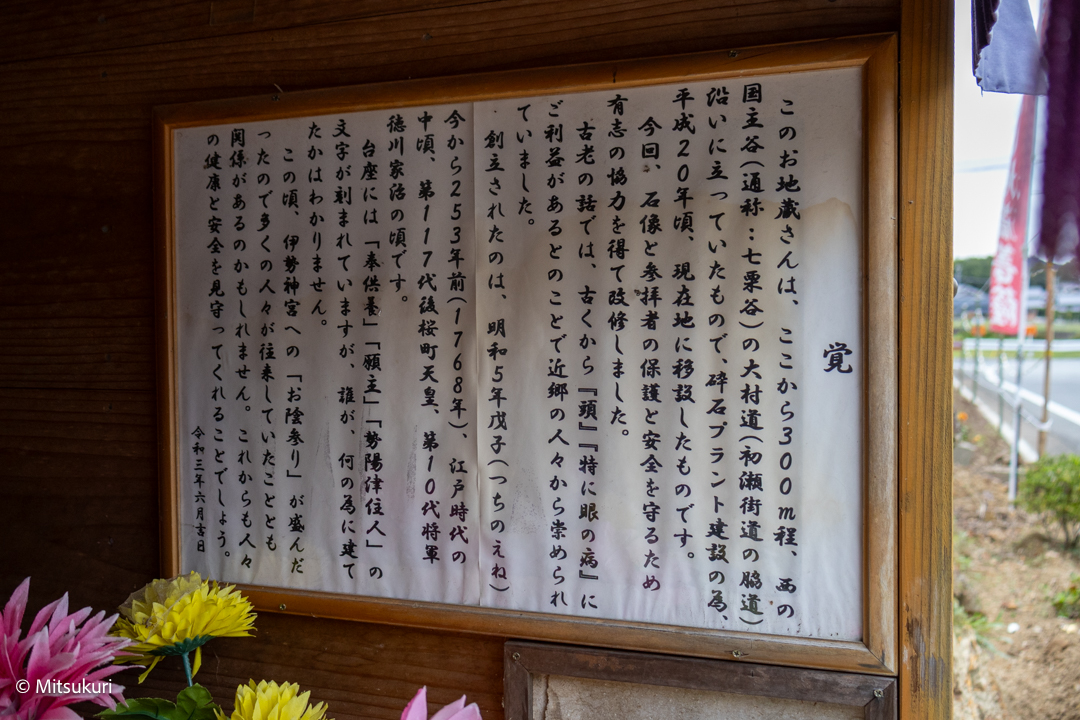 このお地蔵さんは、ここから300m程、西の国主谷(通称•••七栗谷)の大村道(初瀬街道の脇道)沿いに立っていたもので、砕石プラント建設の為、平成20年頃、現在地に移設したものです。