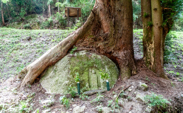 年代不詳 丸柱から音羽に抜ける山道に「みのいし地蔵」の可愛らしい看板が見えました 川辺に降りると杉の根元に抱きかかえられたような磨崖の地蔵さんでした